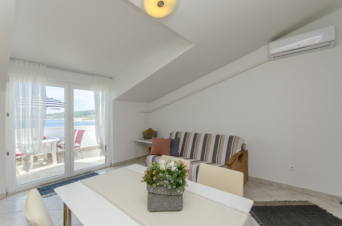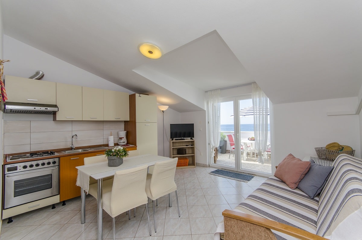 Apartment 1 hat die Fläche von 45 m2, eine Terasse von 8m2 und ist Ost-Süd-West orientiert. Er befindet sich am ersten Stock unseres Objektes. Seine Terasse bietet Ihnen ein wunderschönen Blick auf das Meer. Apartment 1 hat 2 Zimmer: das Schlafzimmer, das Wohnzimmer mit der Küche und das Badezimmer. Im Schlafzimmer befindet sich ein Doppelbett und im Wohnzimmer ein Fernsehern und ein Sofa, das auch, wenn verbreitet ist, für das Schlafen der zwei Personen zugedacht ist.